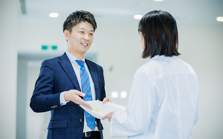 MSという営業職に就いたことで、幅広い医療提案ができることにおもしろさとやりがいを感じています。「医療」と聞くと、理系の人が多い印象があると思いますが、実際は文系が多く、入社後の研修によって、じっくり知識を学ぶことができるため、医薬品や医療機器の知識がゼロでも、安心して始められる職種です。